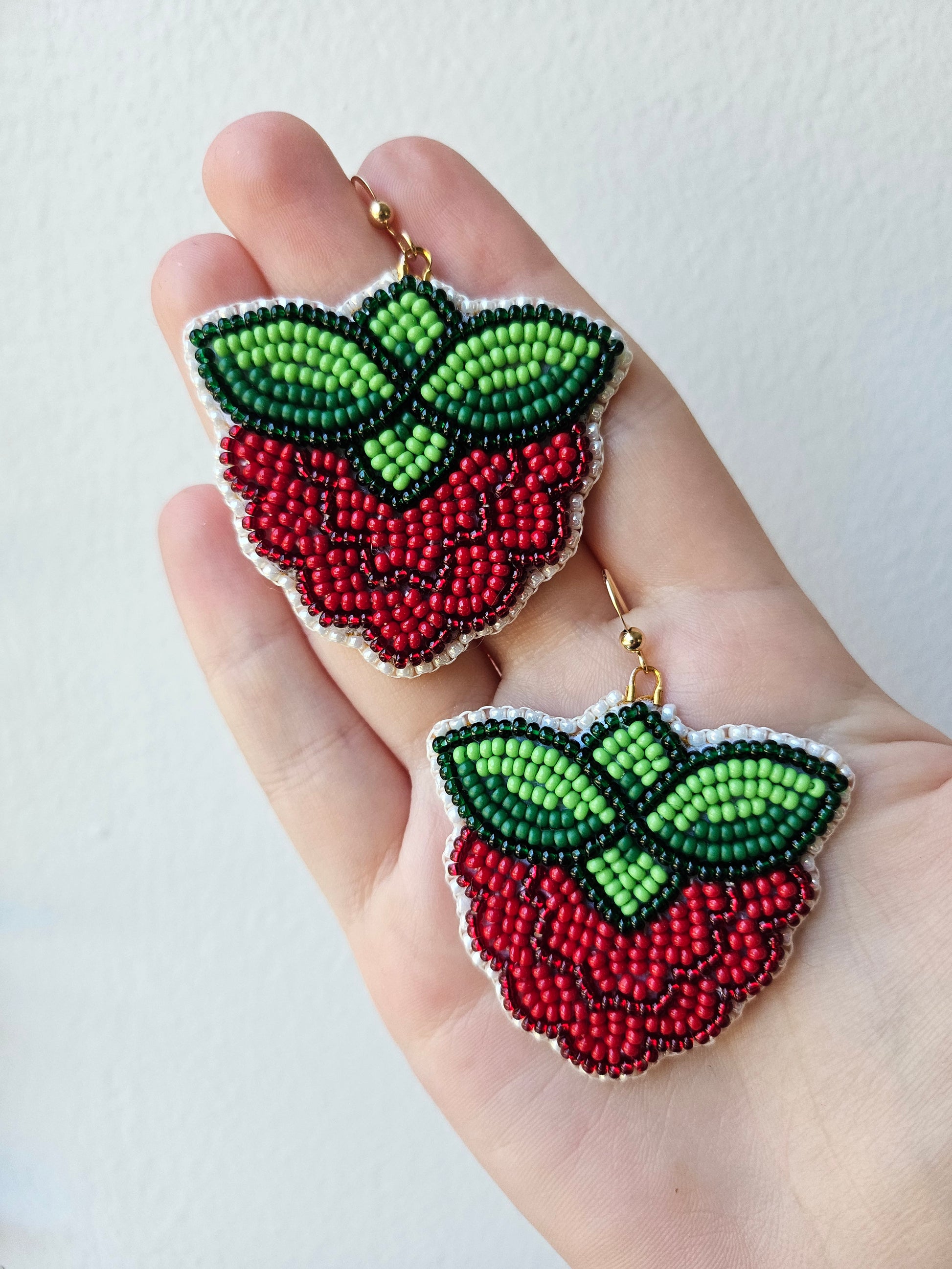Beads on pellon felt with buckskin backing and 14k gold filled hooks.